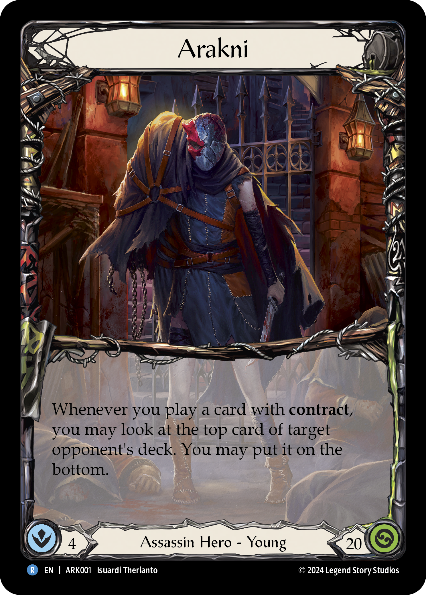Whenever you play a card with contract, you may look at the top card of target opponent's deck. You may put it on the bottom.