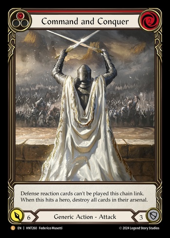 Defense reactions can't be played to Command and Conquers chain link.If Command and Conquer hits a hero, destroy all cards in their arsenal.