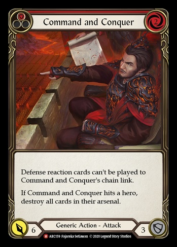 If Command and Conquer hits a hero, destroy all cards in their arsenal.