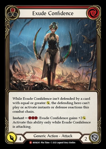 While Exude Confidence isn't defended by a card with equal or greater , the defending hero can't play or activate instants or defense reactions this combat chain.