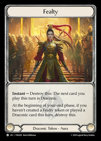 Instant -- Destroy this: The next card you play this turn is Draconic.At the beginning of your end phase, if you haven't created a Fealty token or played a Draconic card this turn, destroy this.