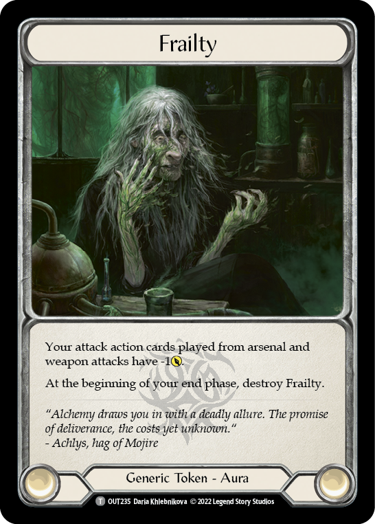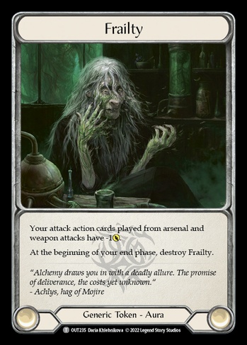 Your attack action cards played from arsenal and weapon attacks have -1 .At the beginning of your end phase, destroy Frailty.