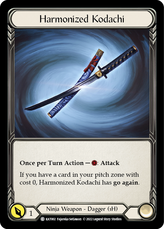 Once per Turn Action - : AttackIf you have a card in your pitch zone with cost 0, Harmonized Kodachi gains go again.