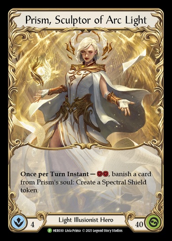 Once per Turn Instant - , banish a card from Prism's soul: Create a Spectral Shield token. (It's an Illusionist aura with "If your hero would be dealt damage, instead destroy Spectral Shield and prevent 1 damage that source would deal.")