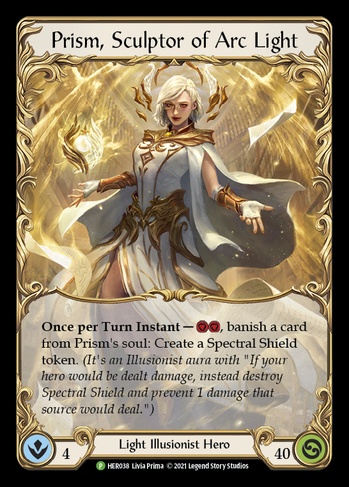 Once per Turn Instant - , banish a card from Prism's soul: Create a Spectral Shield token. (It's an Illusionist aura with "If your hero would be dealt damage, instead destroy Spectral Shield and prevent 1 damage that source would deal.")