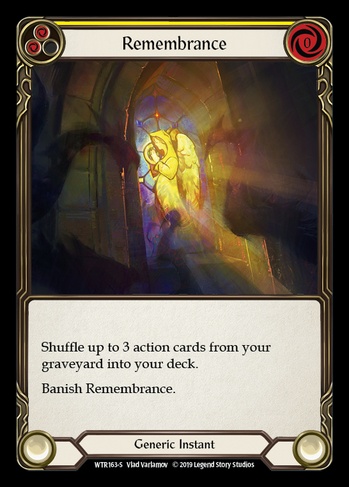 Shuffle up to 3 action cards from your graveyard into your deck. Banish Remembrance.