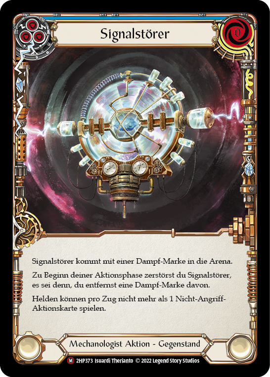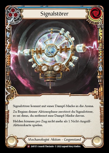 Signal Jammer enters the arena with a steam counter on it. At the beginning of your action phase, destroy Signal Jammer unless you remove a steam counter from it. Each hero can't play more than 1 'non-attack' action card each turn.