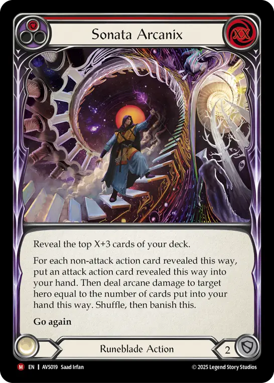 For each 'non-attack' action card revealed this way, you may put an attack action card revealed this way into your hand. Then deal arcane damage to target hero equal to the number of cards put into your hand this way.
