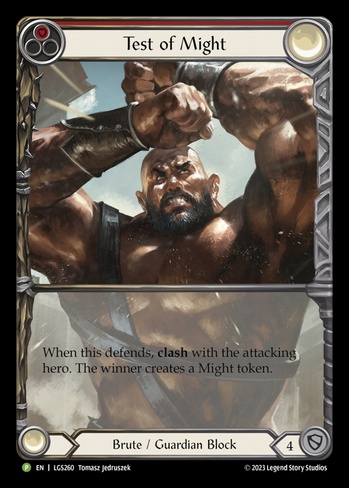 When this defends, clash with the attacking hero. The winner creates a Might token. (Clashing heroes reveal the top card of their deck. The hero that reveals the card with greatest wins.)